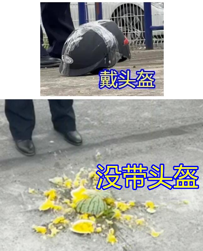 戴頭盔的西瓜幾乎沒有損傷;而沒帶頭盔的西瓜,受到了嚴重的傷害!民警介紹,電動車在行駛過程中平衡系數較低,且駕駛人員身體無遮擋,一旦發生交通事故,車輛容易側翻,駕乘人員的頭會首先著地,而頭部是人體最致命的部位。