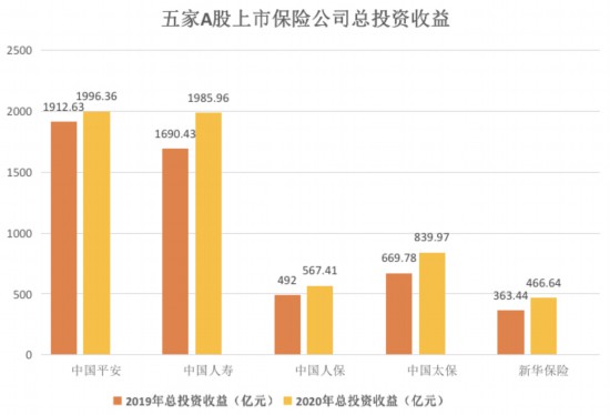 2020年五家A股上市保險公司的投資依舊亮眼,為各家貢獻了不菲的利潤。具體來看,2020年,中國平安總投資收益為1996.36億元,同比增長4.38%;中國人壽總投資收益為1985.96億元,同比增長17.5%;中國人?偼顿Y收益為567.41億元,同比增長15.3%;中國太?偼顿Y收益為839.97億元,同比增長25.4%;新華保險總投資收益為466.64億元,同比增長28.4%。