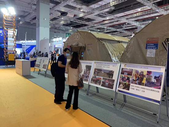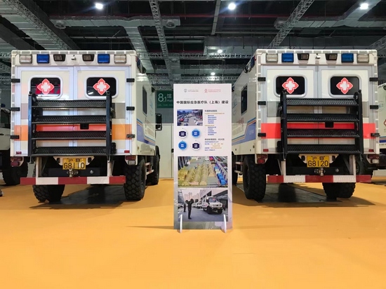 上海市東方醫院整建制承建的中國國際應急醫療隊(上海)隊員向前來觀展的人介紹,現場展示了東方醫院現有的專業救援車輛,包括手術車、輕重傷員轉運車、通訊指揮車、大型物資轉運及存儲車、醫技平臺車、能源補給車、物資儲備車、綜合保障車等。車上配置麻醉機、呼吸機、監護儀、供養設備、除顫儀、心電監護儀、輕便X光機等急救醫療設備,配備生命探測儀、雷達探測儀、破拆設備、大型照明設備、發電機等先進救援設備。這些設備均已實現具備防水、防塵、防震“三防”的制式化裝載,可進行遠程空投和運輸。