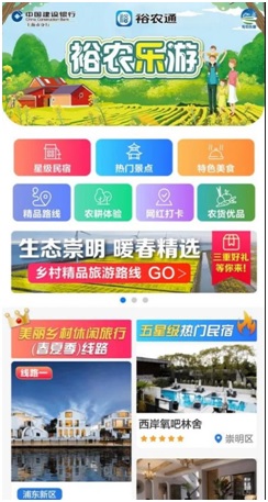 “裕農樂游”平臺目前已經植入“上海建行財管家”微信公眾號的“貴賓專享”標簽,以創新搭建的H5線上系統為載體,引入攜程旅行的成熟運營體系和建行龍支付的金融科技優勢,為八方游客提供“吃、住、行、游、購”等場景的數字化、智慧化服務矩陣,并圍繞每個場景的金融體驗做好豐富多態的數字化閉環建設。