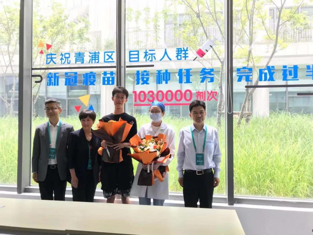 在區體文中心接種點,來自上海政法學院學生郭邦可是第103萬劑次接種市民,55號接種臺、來自朱家角人民醫院的護士蔡星完成本區第103萬劑新冠疫苗的接種工作。