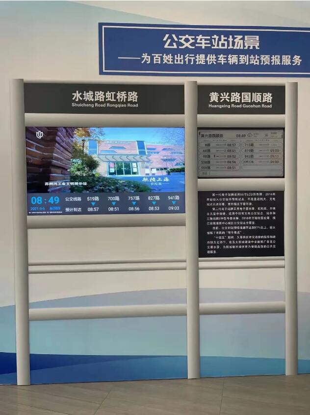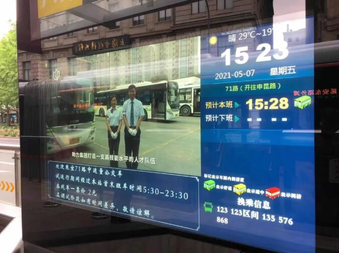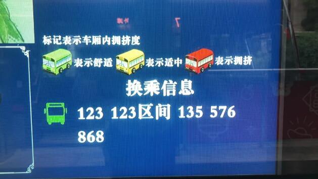 目前,站臺顯示分為兩種,在71路等彩色顯示屏上,所有運營的車輛用不同的顏色標識,其中,綠色代表舒適(尚有空位),黃色代表較舒適(少量站立),紅色代表擁擠(站立空間較。。
