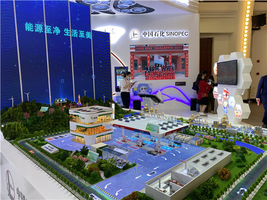 中國石化展示未來“油氣氫電服”綜合加能站模型。 人民網王文娟 攝