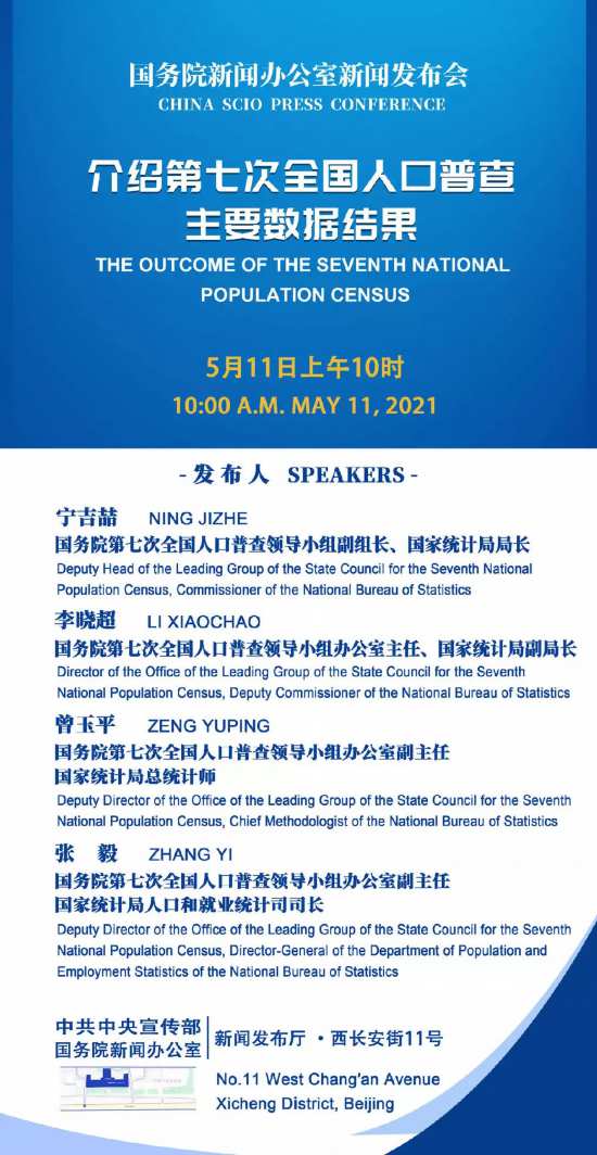 國務院新聞辦公室定于2021年5月11日上午10時舉行新聞發布會,請國務院第七次全國人口普查領導小組副組長、國家統計局局長寧吉喆,國務院第七次全國人口普查領導小組辦公室主任、國家統計局副局長李曉超,國務院第七次全國人口普查領導小組辦公室副主任、國家統計局總統計師曾玉平,國務院第七次全國人口普查領導小組辦公室副主任、國家統計局人口和就業統計司司長張毅介紹第七次全國人口普查主要數據結果,并答記者問。