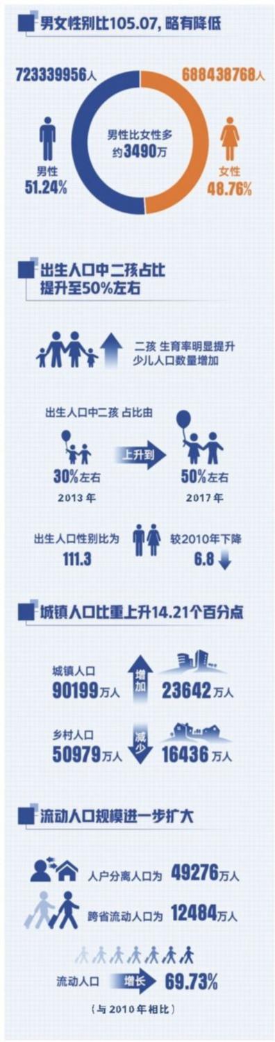 從性別結構看,男女比例持續改善。我國男性人口為72334萬人,占51.24%;女性人口為68844萬人,占48.76%?側丝谛詣e比為105.07,與2010年基本持平,略有降低。