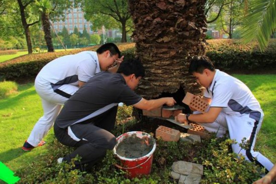 步入華東師范大學附屬天山學校,有櫻花樹護道,有香樟參天,更有桃、杏等果樹飄香。近700株喬木和種類繁多的灌木、草本植物,也成為勞動教育的天然資源,人人投身“綠植養護、生命成長”實踐活動。