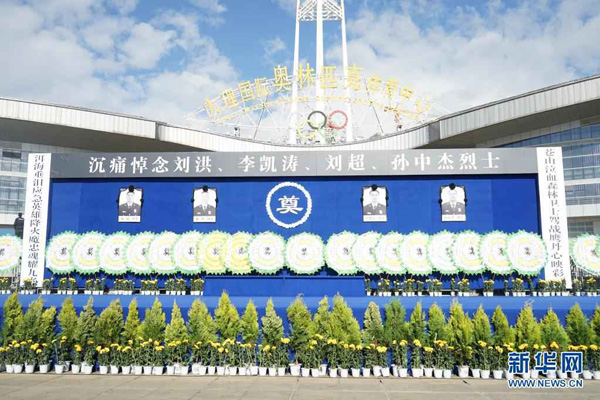 悼念儀式現場莊嚴肅穆,祭禮臺中央懸掛著劉洪、李凱濤、劉超、孫中杰4位烈士的遺像,兩側擺放著各級相關部門敬獻的花圈。