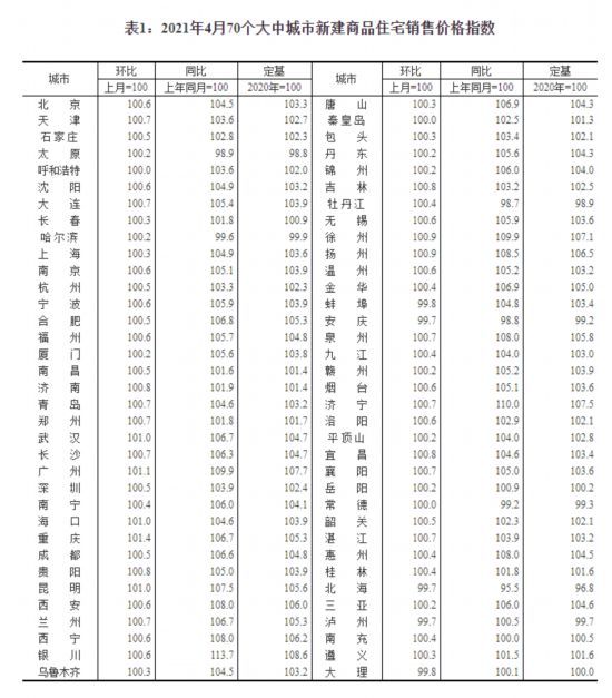 人民網北京5月17日電 (申佳平)今日,國家統計局公布2021年4月份70個大中城市商品住宅銷售價格變動情況。對此,國家統計局城市司首席統計師繩國慶表示,2021年4月份,統計監測的70個大中城市新建商品住宅銷售價格漲幅總體有所擴大,二手住宅漲幅有升有落。