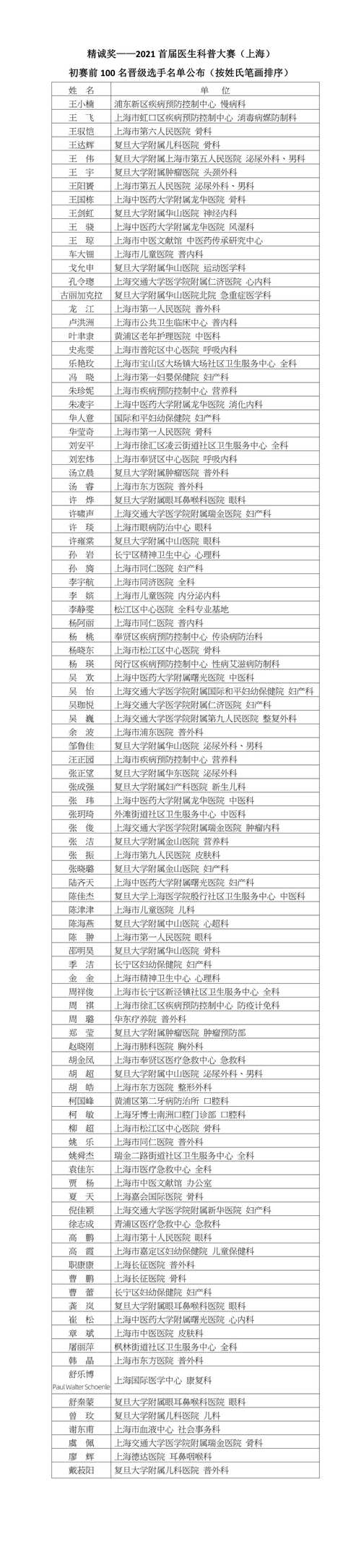 人民網上海5月19日電 (龔莎)集聚各方優質資源,面向全市執業醫師,致力于“互聯網+精準傳播健康科普”的“精誠獎——2021首屆醫生科普大賽(上海)”在社會各界的支持和衛健系統的廣泛參與下,初賽日程結束。截止到2021年5月14日17:00,共有1961名選手上傳參賽作品,公眾觀看視頻次數195.7萬次,投票184.5萬次。經過專家評審、公眾投票、參賽選手資質審查和作品科學性審查等環節,大賽組委會根據綜合評定結果,現對前100名晉級復賽的選手,公布如下(按姓氏筆畫排序):