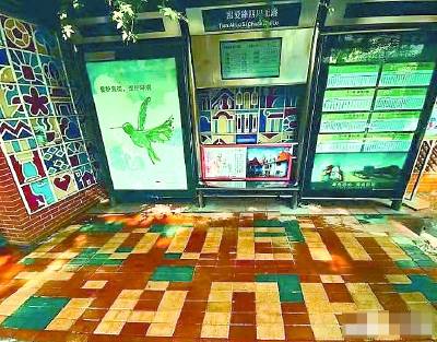 5月12日,記者來到修繕后的甜愛路,發現這條路上注入了更多的愛情元素,變得更加“甜甜蜜蜜”。路的西側鋪上了紅色瀝青路面,人行道換上了彩色鋼渣透水磚,樹篦子也更換一新。甜愛路四川北路站的公交站臺地面用彩磚拼出“LOVE IN TIAN A I” 字樣,將愛的主題凸顯出來。