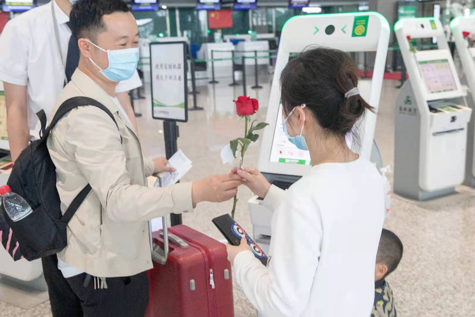 “我們今天是坐飛機出去玩的,中國這么大,年輕的時候還沒來得及和老伴兒一起去逛逛,現在趁跑得動要抓緊去多點地方看看”,旅客王先生一邊說道一邊將擺放在值機柜臺籃子里的一朵玫瑰花遞給了身邊的老伴。還有一些旅客把花送給了自己的父母。任女士是專程來機場為第一次坐飛機的父母送機,在工作人員的協助下,將值機設備旁的兩朵玫瑰花取下送給了爸爸媽媽,她表示,母親很喜歡玫瑰花,收到之后也非常的開心。