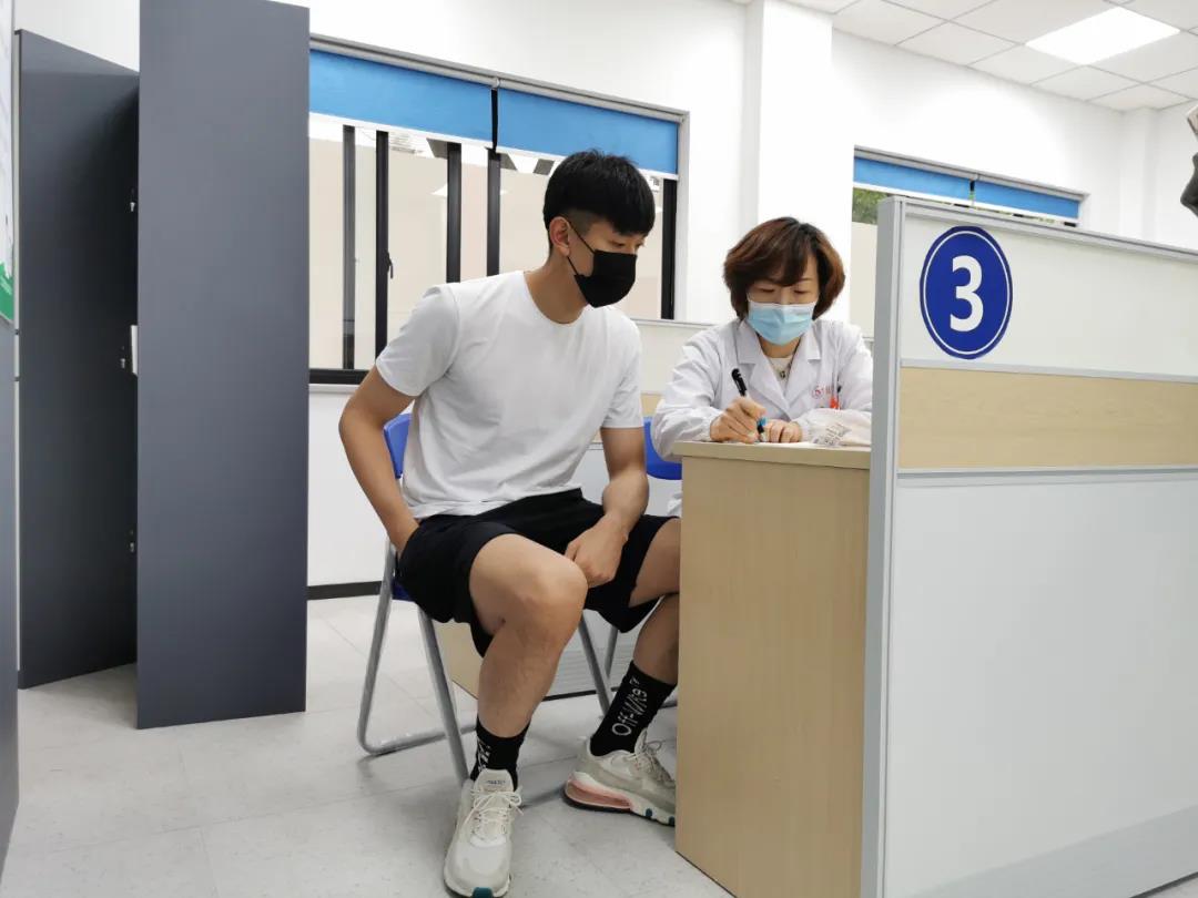 在接種過程中,醫生做到“信息核對、二次問檢”,全力護航球員們的疫苗接種工作,并叮囑四位球員第二針的接種時間、接種后的身體注意事項。接種完畢后,在殷行街道的志愿者指引下,球員們進入留觀區,由留觀區內的醫務人員關注球員們的接種反應。