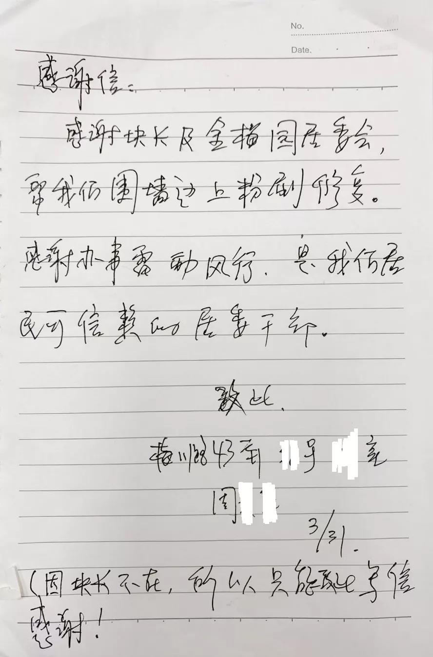 待檢驗完恢復效果后,激動的周阿姨便向居委會送來了感謝信。盡管感謝信的語言非常樸實,但正是在最鮮活的群眾語言中,人們看到了大家對于居民區黨總支、居委會工作的高度肯定與充分認同。正是黨總支、居委會在問題面前表現出的為民意識,再一次充分展示了建黨百年以來中國共產黨 “立黨為民”的不變初心與不渝宗旨。