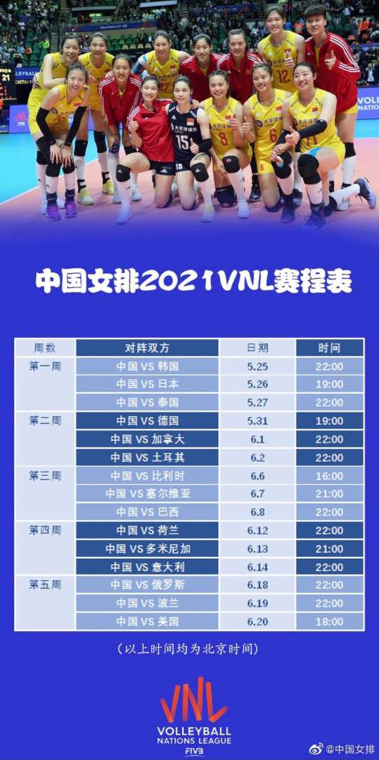 2021世界女排聯賽中國隊賽程表。中國女排官方微博截圖