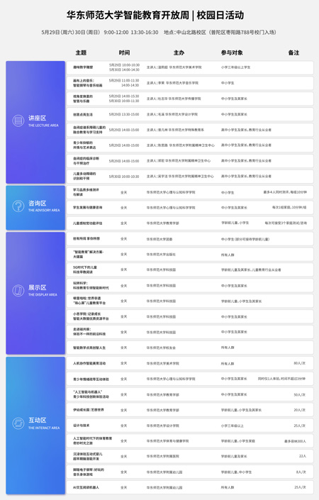 除了7場走出校門的公益咨詢服務活動外,5月29日、30日的校園公眾開放日活動,參加者將走進華東師大校園,參與講座、咨詢、展示、體驗等四大類型活動,與教育、醫學、心理、音樂、體育、美術、傳播等十多個不同學科的專家教授面對面交流,沉浸式體驗智能教育的濃厚氛圍和真實場景,體會教學方式和知識傳播之變革。