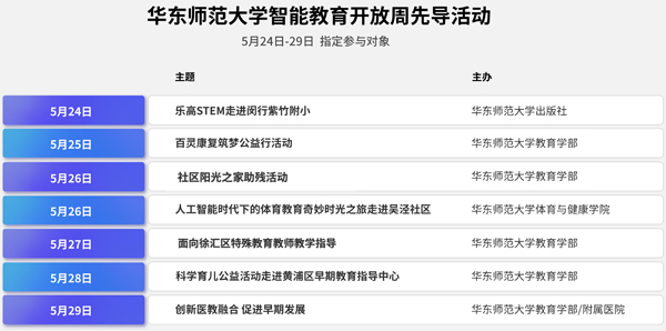 5月24日,華東師范大學智能教育周全面啟動。其中5月29日、30日在華東師范大學校園舉辦的智能教育公眾開放日今日起開放預約,對象是全市幼兒園到大學的學生和學生家長。