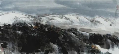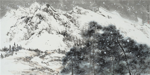 此次展覽海報上的巨幅《萬里雪飄》是她在辛丑開春的雪中所作。靈感雖然源于毛主席的詩作《沁園春·雪》,可是感動卻來自于當下。畫中一行人艱難地逆風前行,略帶墨色的天空,暗示著夜色。只有最勇敢的人,才會冒著漫天飄雪夜攀山路!度f里雪飄》,50×100cm,紙本設色 ?藝術家