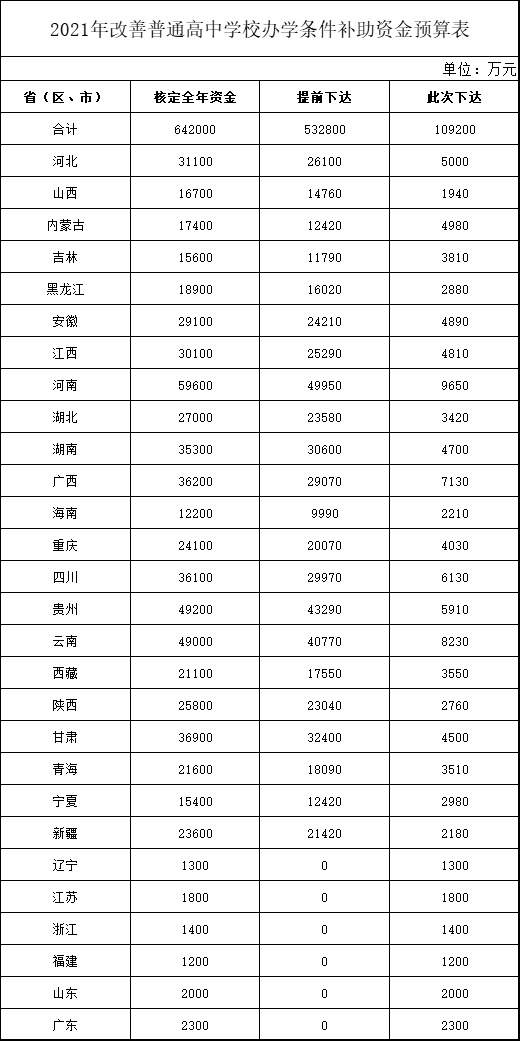 人民網北京5月25日電 (記者王震)據財政部網站消息,近日財政部、教育部聯合印發《關于下達2021年改善普通高中學校辦學條件補助資金預算的通知》(以下簡稱《通知》),本次向各。ㄗ灾螀^、直轄市)下達改善普通高中學校辦學條件補助資金預算合計10.92億元,此前已提前下達53.28億元。
