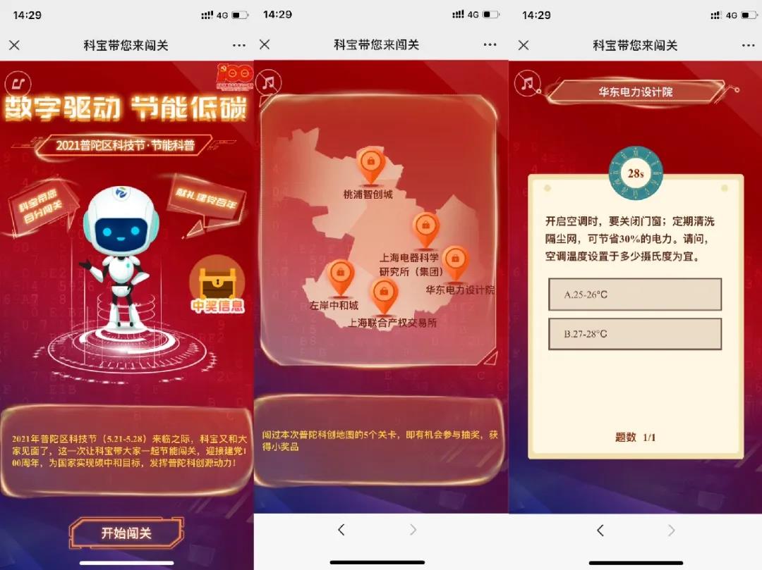 除了線下的數字化轉型節能經驗的分享,在線上,普陀區科委還推出了“科寶帶你來闖關”的微信小程序游戲。打開游戲,由普陀科技的形象IP“科寶”帶領用戶以闖關形式,對普陀區內華東電力設計院、左岸中和城、桃浦智創城等科創點位進行闖關打卡,每一關卡都設置了相關的數字化節能知識,闖關成功還可獲得相應的獎勵,以游戲形式將低碳節能生活理念推及公眾。據介紹,自5月21日,小程序游戲上線以來,已累計有871位用戶參與互動。