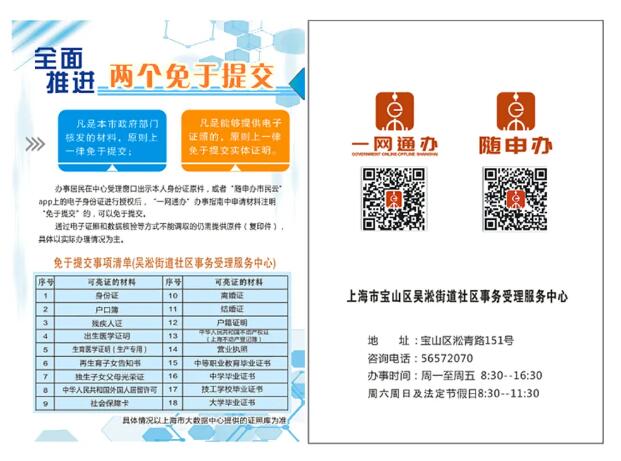 “兩個免于提交”是指在吳淞街道社區事務受理服務中心開展政務服務過程中,通過電子證照應用、數據核驗等方式,實行“凡是本市政府部門核發材料,原則上一律免于提交;凡是能夠提供電子證照的、數據核驗的,原則上一律免于提交實體證照”,具體以實際辦理情況為準。