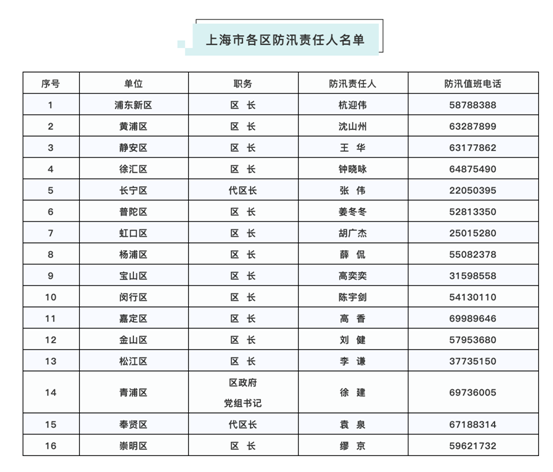 上海市各區防汛責任人名單 圖片來源:上海市防汛指揮部微信公號