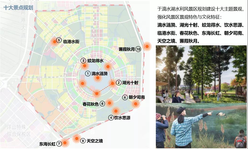 十大主題景觀分別是滴水漣漪、湖光十射、蛟龍得水、飲水思源、臨港水街、春花秋色、東海長虹、朝夕思南、天空之鏡、蒹葭秋月。