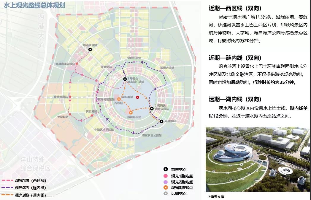其中,一湖即滴水湖,一環指春漣河及二環公園帶,一軸指臨港主城區東側沿海大堤,七射指七條射河和兩岸綠地,多點指航海博物館、海昌海洋公園、上海天文館等主要景點。