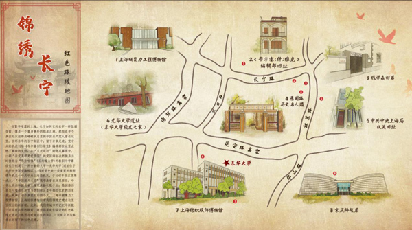 上海紡織服飾博物館、宋慶齡陵園、中共中央上海局機關舊址、愚園路歷史名人墻、《布爾塞維克》編輯部舊址……在活動現場,長寧區與東華大學一同發布了“錦繡·長寧”紅色革命文化學習路線,一張包括長寧區8處紅色地標的手繪地圖新鮮出爐。這份獨特的長寧版手繪黨史學習教育地圖,將轄區內8家具有代表性的紅色文化資源有機融合,形成一條紅色學習路線。
