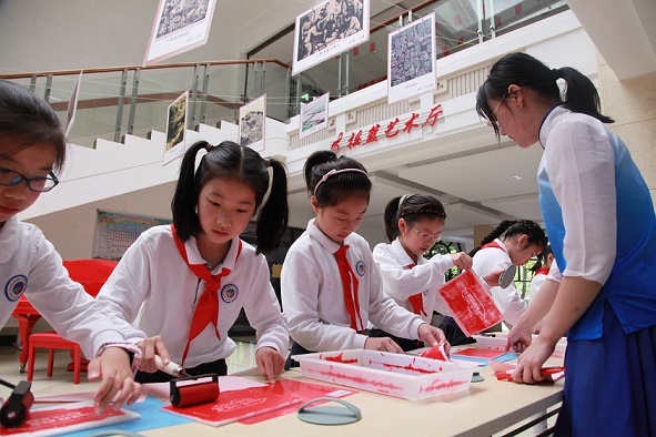 學校以“六一”兒童節開展“童心向黨”活動為契機,將十個數字博物館移到線下,搬進校園,開展“建黨百年博物館校園行”游園活動。設置十個游園場館,每一個場館進行一個主題布展,開展一項藝術體驗。主場館“中共一大紀念館”以版畫為主要藝術載體,帶領學生在欣賞版畫、制作版畫的藝術體驗過程中,了解從紅船起航的中國革命史和奮斗史,感悟版畫的藝術力量。