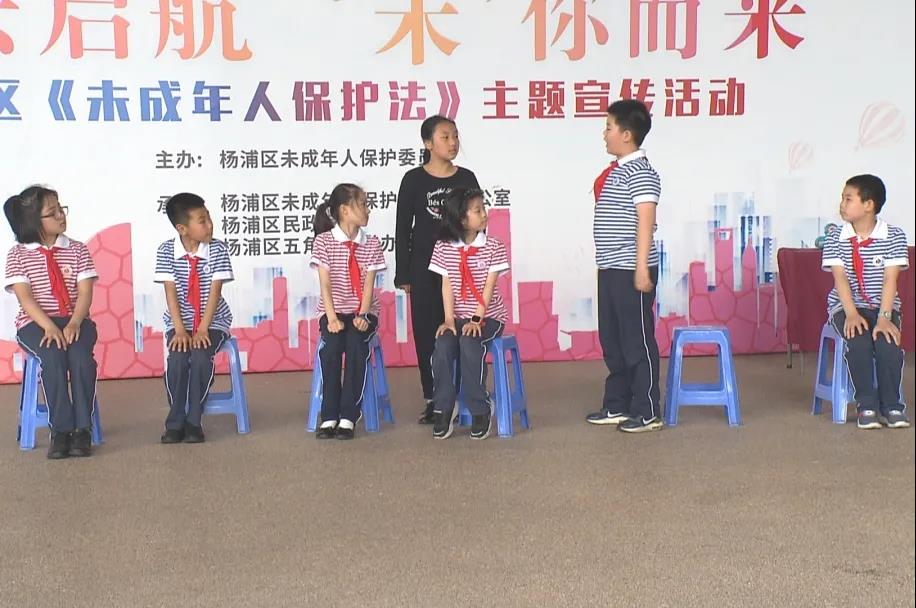 在五角場廣場,一場與《未成年人保護法》有關的知識競答正在火熱進行。這些問題對臺上還不滿十歲的孩子們來說頗有難度,但大家還是認真思考,努力分辨正確答案。