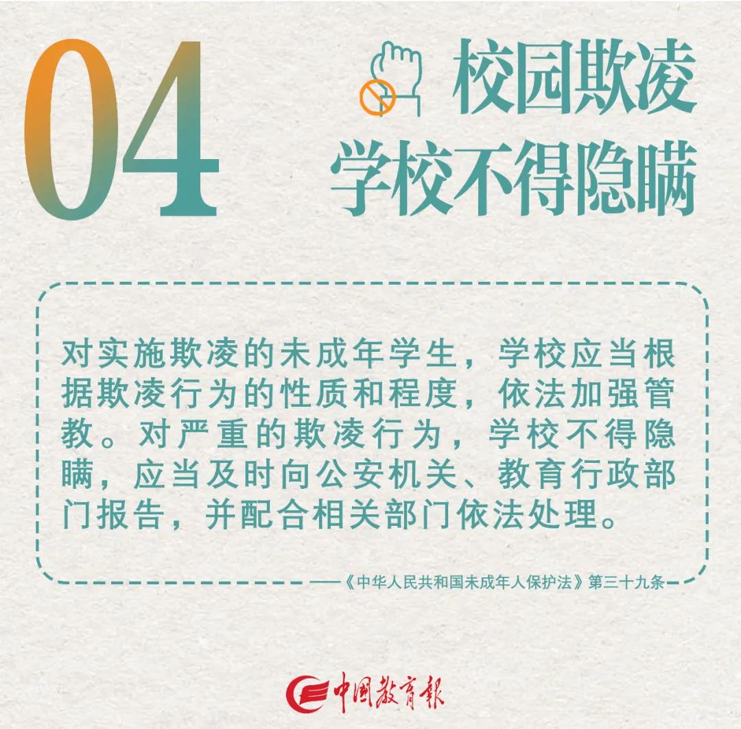 記者了解到,近年來,校園欺凌、青少年沉迷手機、未成年人網絡沉迷等相關問題頻頻進入公眾視野,越來越受到關注,此次《未成年人保護法》修訂制定和完善了一系列相關制度措施。一起來看較受老師和家長關注的9個要點: