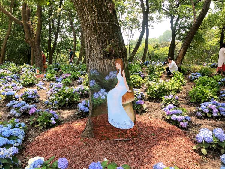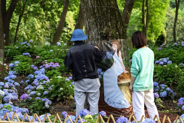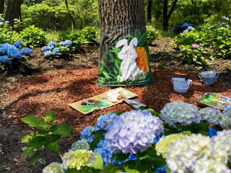 初夏,八仙花展正在共青森林公園舉行。走入公園新打造的八仙花花園,只見樹干上有一位美麗的“少女”,正欣賞花園美景;“鉆進”了一只“小松鼠”,想著哪里有松果;還“躲藏”了一只“浣熊”,準備夜間出來搗蛋。仔細一看,原來,這都是畫。