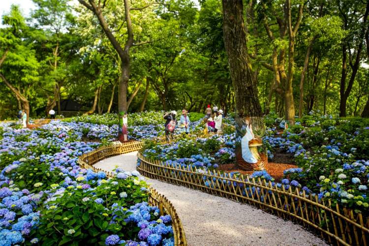 在新八仙花主題園,鋪設有一條蜿蜒小徑,兩側用竹子作矮籬,乍一看,一個“美女”坐在蘑菇椅上欣賞著八仙花;▓@中間鋪小碎石為路,走近一看,一只啃著蘿卜的“兔子”從草叢中探出腦袋,可愛至極。環坡道上,遠遠望去有一位亭亭玉立的“少女”彎著身子撫摸著八仙花中最常見的品種“無盡夏”。在天然的樹洞里一只“小浣熊”,悄悄地探出頭來,欣賞外面的八仙美景呢,還有一對松鼠在隔空搶松果。
