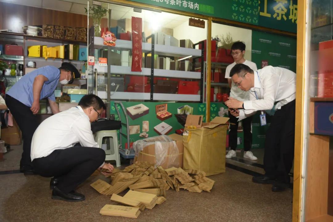 其中,在對“某茶茗軒”檢查中發現,其包裝材料從“某茶葉包裝店”進貨,由溫州某公司快遞到本市。經查,今年以來溫州的這家公司共對本市多家企業發過包材類快遞。市局執法總隊聯合靜安區局執法大隊,立即對涉案企業進行檢查,查扣印有“西湖龍井”字樣的包裝盒及包裝袋8萬余個,并第一時間將相關情況通報浙江省市場監管部門。
