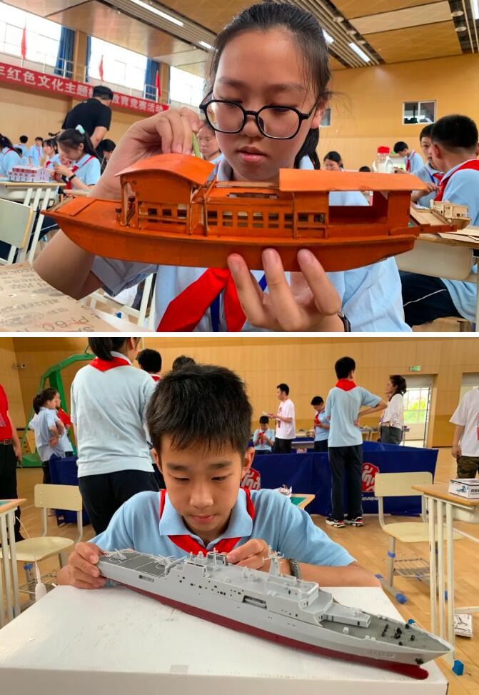 一聲令下,145名學生齊動手,南湖“紅船”、中國人民海軍軍艦、中國共產黨一大會址、紅軍橋等一件件模型作品被呈現出來。這是6月1日下午,劉行新華實驗學!凹t心向黨,匠心育人”科技模型系列競賽活動上的一幕。