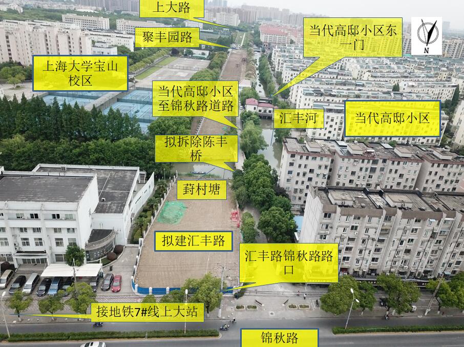 上海大學西側規劃匯豐路(錦秋路-上大路段)辟通工程北起錦秋路,南至上大路,東靠上海大學西部校區,西臨匯豐河,中接聚豐園路。匯豐路建成前,周邊小區居民乘坐地鐵,需繞道而行,或從上海大學、當代高邸小區穿行而過,受疫情影響,校園、小區不對外開放,周邊居民出行極為不便?⒐ず蟮膮R豐路不僅解決了聚豐園路(祁連山路東段)交通擁堵的狀況,也為周邊居民及上海大學師生的出行帶來了極大的便利。