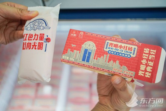印有“前路漫漫向光明”的光明小紅磚,包裝復古又時髦。據悉,小紅磚的設計靈感來源于中共一大會址的紅磚,在光明經典冰磚的基礎上,通過新的設計、新的口味,詮釋“經典正當紅”。