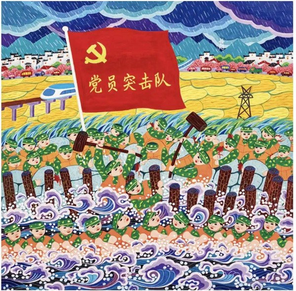 青陽農民畫-《洪峰浪尖鑄黨魂》沈揚林 安徽省池州市青陽縣