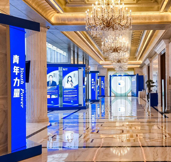 2021浦江創新論壇主會場,以“青年力量”為主題的照片墻,展示十幾位青年科學家的照片及他們的科研成就。