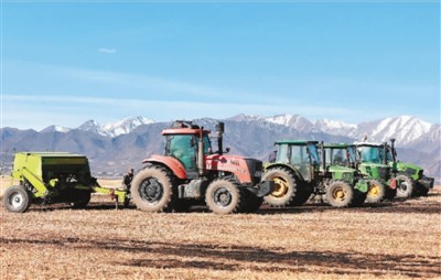 幾臺大型聯合收割機從田地的那頭開了過來,不過半個小時,就收割完了這片150畝地的麥田,脫粒后的麥子,立即輸送到等在田邊的運輸車上,接著就是去雜、烘干和裝倉。田地里,還有一臺打捆機正在撿拾頭天收割過的麥田,打包成一個個結實的麥秸捆,并運出農田。隨后,一臺加裝了北斗導航系統的精量播種機跟了上來,將玉米種子播下。從收割、耕整到播種,機械化流程環環相扣,實現了“三夏”一條龍作業。