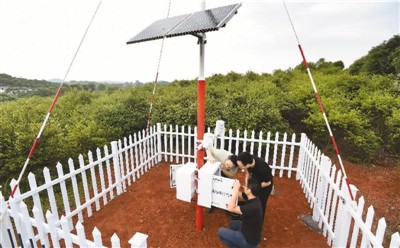 5月28日,江西省宜春市氣象局工作人員在袁州區西村鎮分界村高產油茶種植基地調試智慧農業氣象設備。