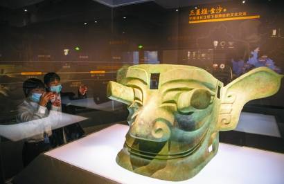 展品中最具特色的文物之一,當屬1986年出土、現藏于四川廣漢三星堆博物館的國家一級文物:戴金面罩青銅人頭像。這是一件帶著黃金面罩的青銅人頭像,它的大小形狀、面部特征跟普通的青銅人頭像沒有什么差別,但因為臉上多了一層金光閃閃的金面罩,從而變得格外珍貴。
