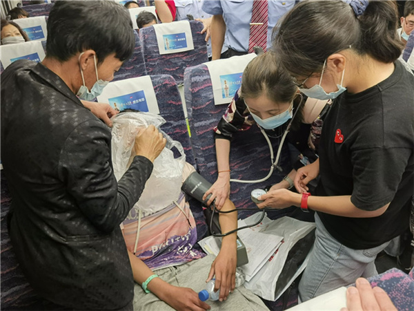 “我們聽見廣播后瞬間意識到,孩子就坐在我們身后不遠處!敝匕Y醫學科醫師史婧奕告訴記者,他們立即帶上隨身的急救設備和藥品趕到孩子身邊。隊員們敏銳地發現了細節:孩子的手腕上有住院手腕帶,隨手放在一旁的行李上,也有醫院影像診斷的膠片報告袋!八麄兪菑钠照吆谡旧宪嚨,我們猜測,或許正是要趕去昆明問診!