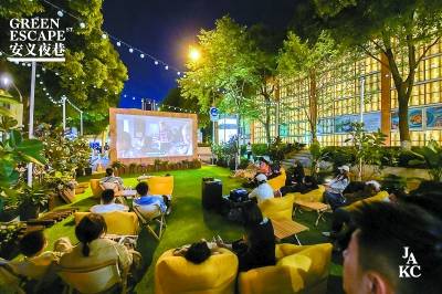 而在安義夜巷,除了此前就人氣很高的花藝區,不少顧客在接受采訪時都提及了位于安義路盡頭的一處“露天電影”區。一塊大大的投影屏幕前零零散散地堆著十來個懶人沙發和幾把折疊椅,再往后一些則是木質的階梯觀影區,夜幕降臨后這里可以說是“一位難求”!凹瓤梢钥措娪,也是一個挺好的休息區域”,帶著老公孩子來逛夜市的錢女士說,露天電影對于現在的小朋友來說是一個挺陌生的活動,能在市中心區域找到這樣一處環境好、氛圍佳的露天影院懷舊一把,著實是一個不小的驚喜。