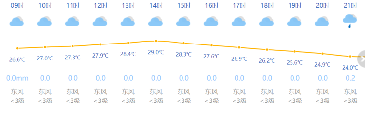白天多云到陰有分散性短時陣雨,夜里雨勢增強,今夜到明天累計雨量局部可達大雨程度,早晨06時前后,上海全市氣溫在24℃附近,預計今天最高29℃,偏東風3~4級,空氣相對濕度95%~65%。