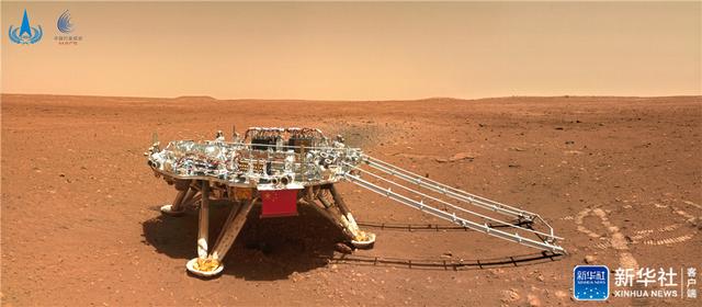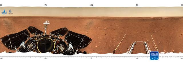 著陸點全景圖,是火星車尚未駛離著陸平臺時,由火星車桅桿上的導航地形相機,進行360°環拍,經過校正和鑲嵌拼接而成。圖像顯示,著陸點附近地勢平坦,遠處可見火星地平線,石塊豐度和尺寸與預期一致,表明著陸點自主選擇和懸停避障實施效果良好。