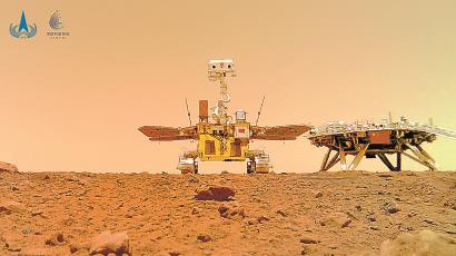 “著巡合影”圖,是火星車行駛至著陸平臺南向約10米處,釋放安裝在車底部的分離相機,之后火星車退至著陸平臺附近,分離相機拍攝的火星車與著陸平臺的合影。圖像通過無線信號傳送到火星車,再由火星車通過環繞器中繼傳回地面。