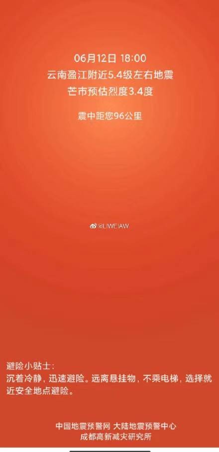6月12日18時,云南德宏州盈江縣發生5.0級地震,中國地震預警網大陸地震預警中心給德宏州提前24秒預警,提前120秒給昆明市預警。