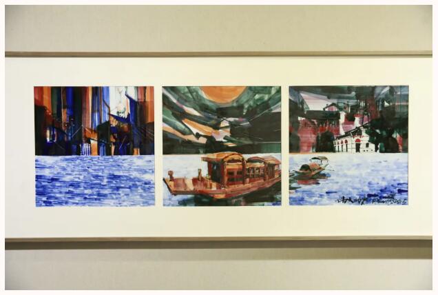 展覽的首幅展品《偉大的啟航》,是此次展出的唯一一個三聯瓷板畫作品。第一幅以黑色為主基調,凄風苦雨的舊中國,希望之光在“一大”會址中孕育;中圖重點著墨于“紅船”,血色殘陽、烏云密布間,民族復興的征程就此開啟;第三幅圖則是當代中國的盛世景象,高樓林立的陸家嘴,展現著時代之都的魅力。