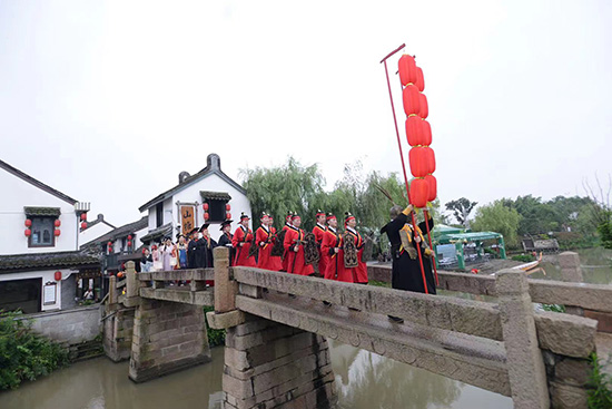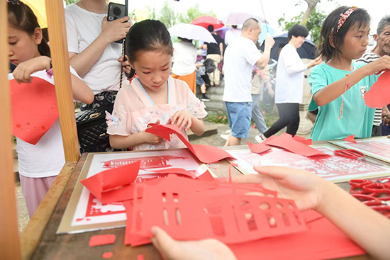 人民網上海6月14日電(王文娟)手寫紅色明信片、紅船—石庫門剪紙、印制黨徽版畫……13日,上海市金山區廊下鎮山塘老街形象墻橋邊市集熱鬧非凡。今年的“端午節”遇上了“文化和自然遺產日”,廊下鎮充分利用紅色資源、紅色陣地,舉辦系列紅色主題、活潑有趣的非遺民俗活動,精彩紛呈的文娛活動,邀請廣大市民一起“粽”享端午,歡度假期。